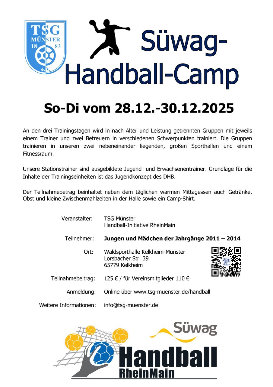 Nach dem Erfolg im Vorjahr wurde das alljährliche Handballcamp, welches die TSG Münster in Kooperation mit der Handball Initiative RheinMain und mit der Unterstützung der Süwag Energie AG üblicherweise immer zwischen den Jahren veranstaltet, dieses Jahr wieder in die erste Januarwoche verschoben.